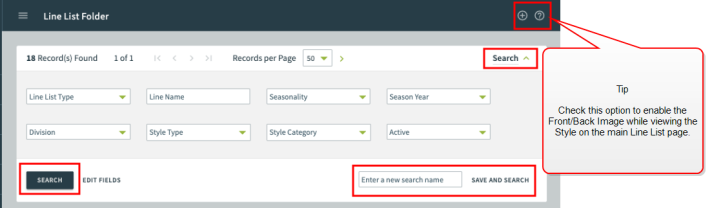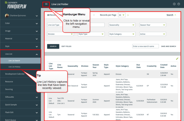 The Line List module allows users to create and manage Line List by adding and modifying Styles then requesting a sample from designated partners. All existing lines are listed within the Line List main page. Use the search field to find the appropriate line list if needed.