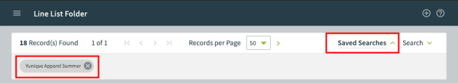 The Search panel allows users to locate a specific line list by using the search filters or browsing through pages. Press the Search arrow to reveal the hidden search fields. A frequented search can be saved for future use by defining the search fields, entering a search name then pressing Save and Search.