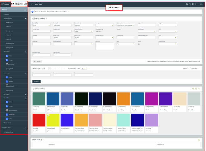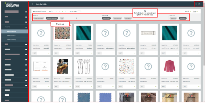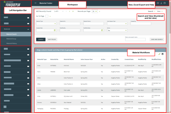 Material is a general term in Gerber YuniquePLMTM used to describe all the components necessary to make up a style. Materials include fabric, buttons, zippers, packaging, and more. All raw materials in YuniquePLMTM are stored in and linked from the Material Folder. Select the Material link within the left navigation bar to access the Material Folder.