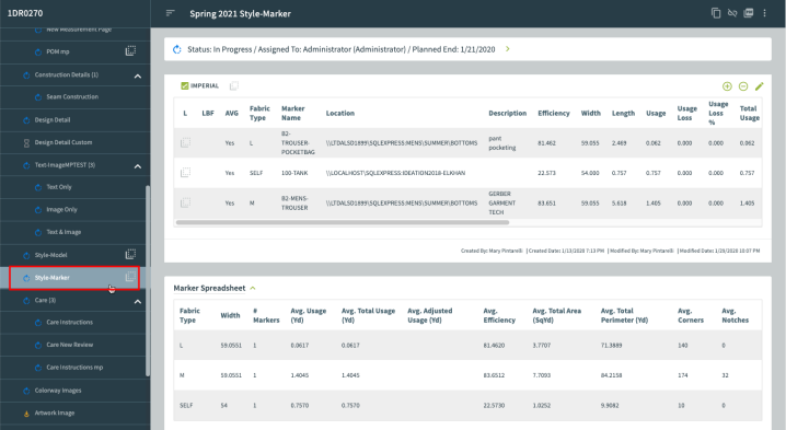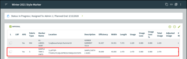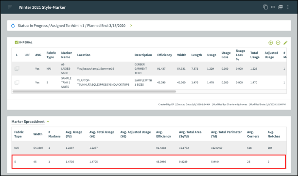 - Marker Spreadsheet: This is an averaging section matching Fabric Type and Width as criteria.