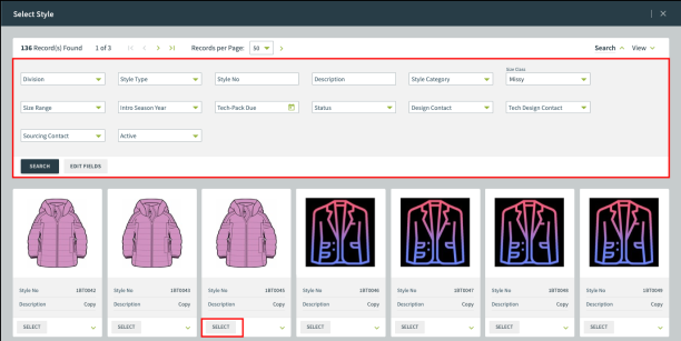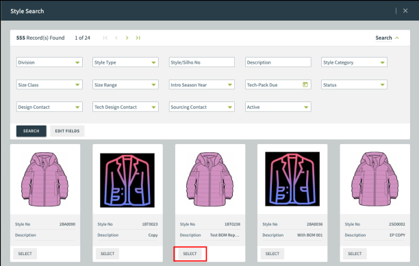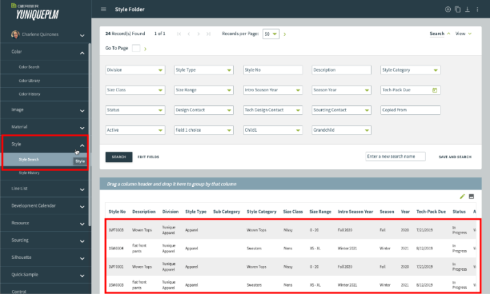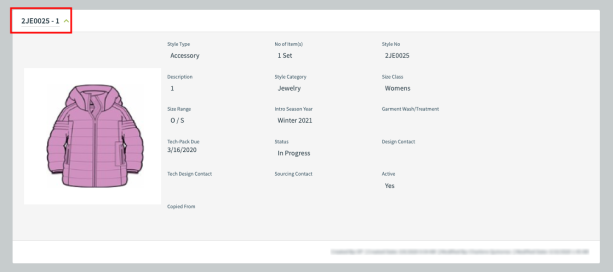 - Style Header Information: Expand the Style Header, using the green arrow, to reveal the Style’s details.