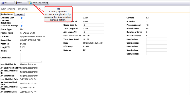 If there is not a check mark in the Linked to CAD field, then all other fields on the page will be editable and will not match the data saved by the AccuMark system. However, this can be rechecked and refreshed with the data from the AccuMark system as well.