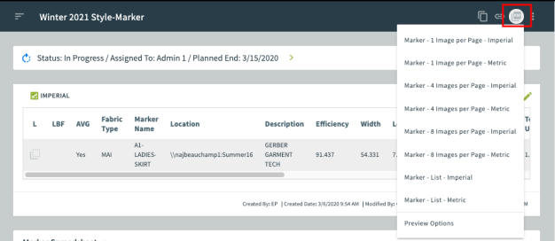 Generate a Style - Marker report by clicking the preview button. A drop-down opens to reveal a list of available reports.