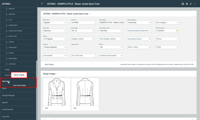 The Style Tech Pack area contains preset page groupings from within a Style Folder. These page groupings are generated as PDFs and either printed, emailed and/or shared with vendors, etc.