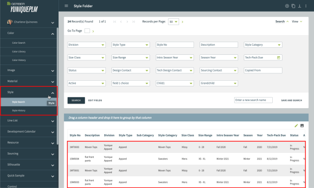 Style Header Information: Expand the Style Header, using the green arrow, to reveal the style’s details.